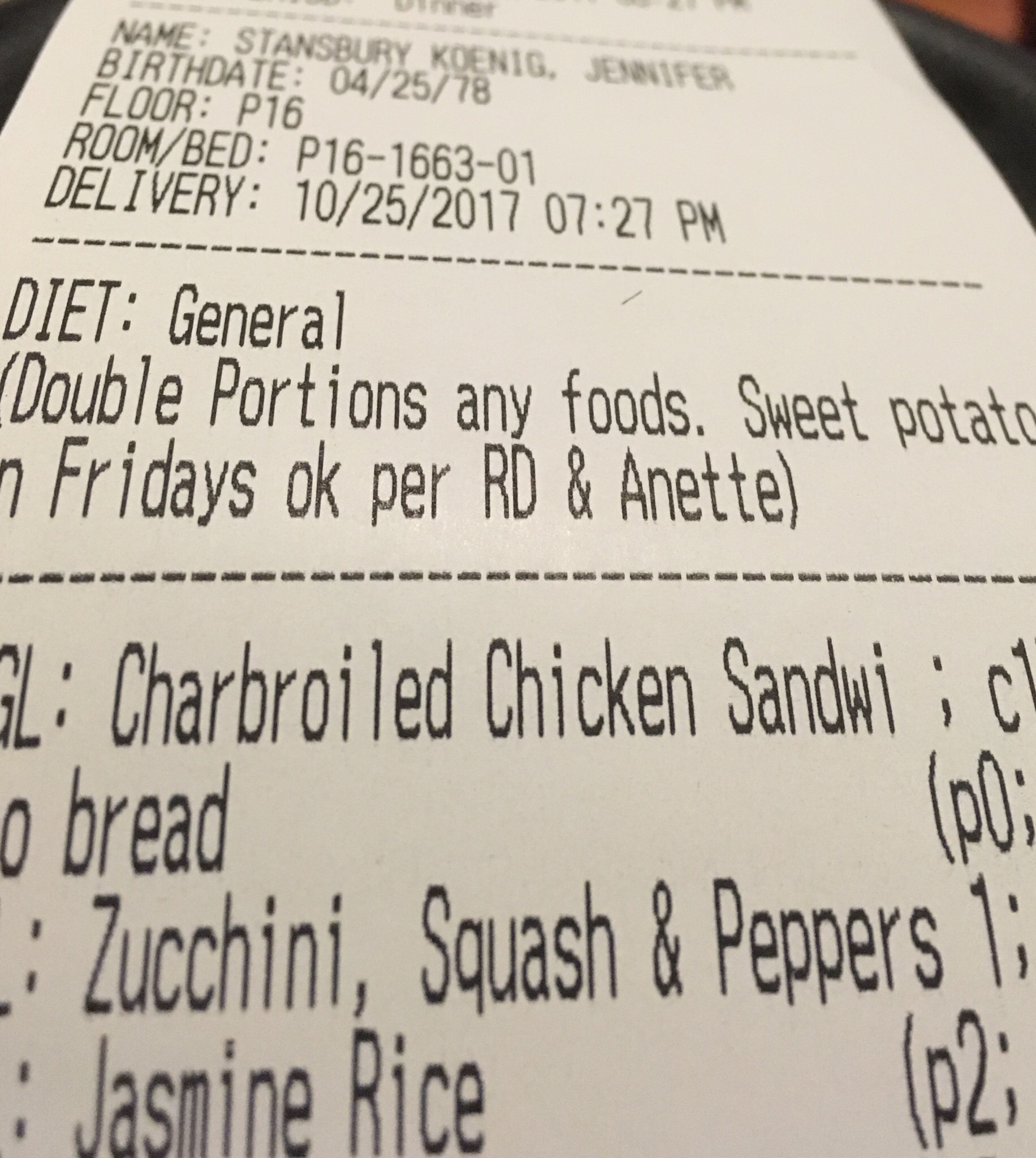 The food you put into your body is your fuel, so I consume fuel that works for me. And the only way I’ve been so well-fueled is because my husband runs a few blocks away to Trader Joe’s or local restaurants, twice a day, to bring me something other than the options available on the hospital menu.